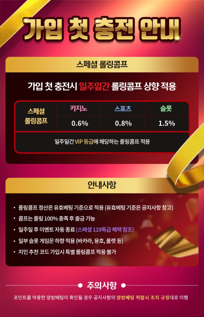 벳119에서는 신규 가입 회원을 대상으로 첫 충전 시 일주일간 VIP 등급에 해당하는 롤링 콤프를 적용해드립니다.