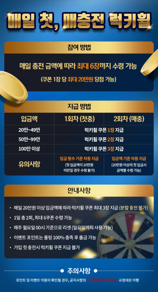 - 매일 20만 원 이상 입금액에 따라 럭키 휠 쿠폰 최대 3장 지급(분할 충전 불가)