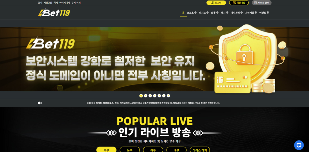 이러한 흐름 속에서 오늘도 안전하고 편안한 온라인 베팅 라이프를 즐기기 위해 막대한 자본금을 바탕으로 믿을 수 있는 벳119를 소개합니다. 벳119는 다양한 라이브 카지노 게임뿐만 아니라 슬롯, 스포츠, 낚시, 미니 게임, 가상 게임 등 여러분이 원하는 모든 게임을 지원하는 대한민국 최고의 안전놀이터입니다.