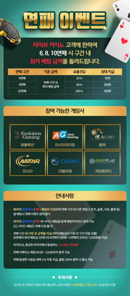 - 바칼 플레이어/뱅커 베팅만 인정되며, 연패 구간 내 다른 게임(스포츠, 슬롯, 식보, 룰렛 등)을 베팅 시 연패 이벤트 참여 불가