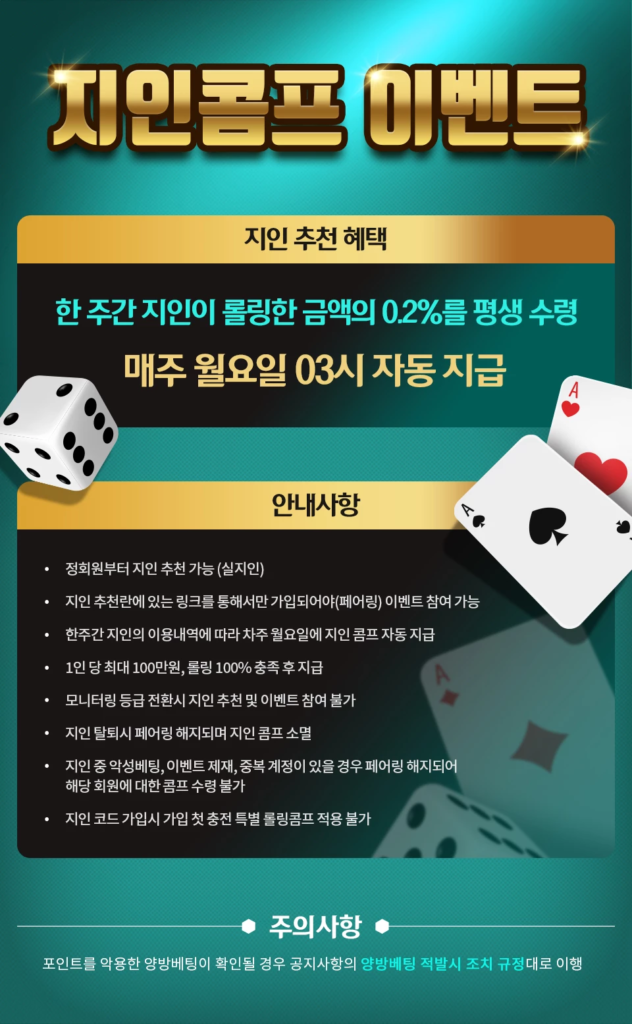 - 지인 중 악성 베팅, 이벤트 제재, 중복 계정이 있을 경우 페어링 자동 해지 및 해당 회원에 대한 콤프 수령 불가