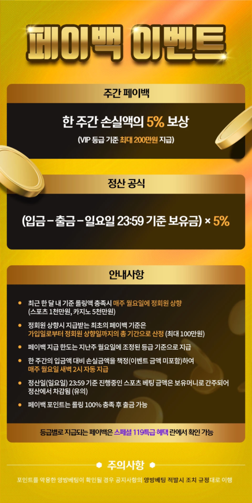 벳119에서는 매주 손실 금액의 5%를 등급에 따라 최대 200만 원까지 지급합니다.