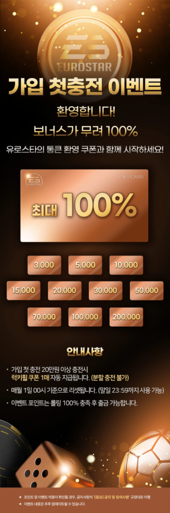 유로스타카지노는 신규 가입 회원을 대상으로 첫 충전 금액의 최대 100%를 돌려드리는 통큰 환영 쿠폰이 지급됩니다.