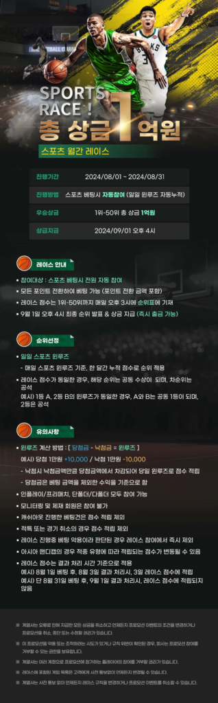 스포츠 베팅을 마음껏 즐길 수 있는 유로스타카지노에서는 총상금 1억 원이라는 엄청난 규모의 월간 스포츠 레이스를 진행 중입니다. 스포츠 베팅을 즐기는 것만으로도 자동으로 참여되는 이벤트로 자세한 참여 방법은 다음의 안내 사항을 참고하시기 바랍니다.