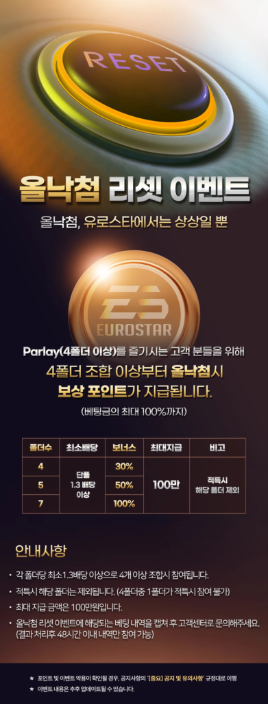 - 올낙첨 리셋 이벤트에 해당되는 베팅 내역을 캡쳐 후 고객 센터로 문의해야 정상 참여 가능 (결과 처리후 48시간 이내 내역만 참여 가능)