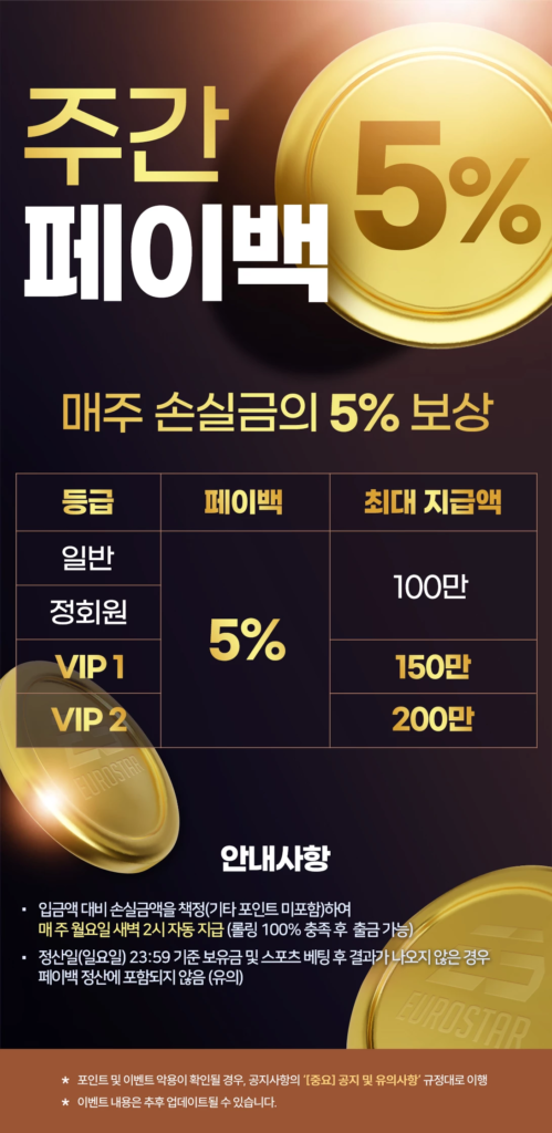 유로스타카지노에서는 매주 손실 금액의 5%를 등급에 따라 최대 200만 원까지 지급합니다.