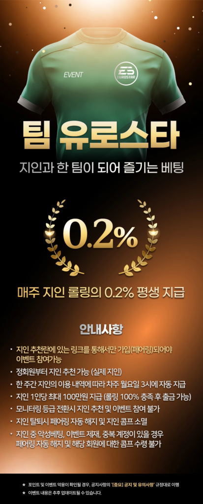 유로스타카지노에서는 지인과 한 팀이 되어 즐기는 베팅을 응원하기 위해 매주 지인 롤링의 0.2% 평생 지급합니다.