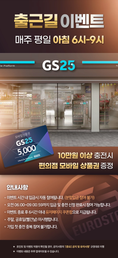 유로스타카지노에서는 10만 원 이상 충전한 회원을 대상으로 GS25 편의점 모바일 상품권을 지급합니다.