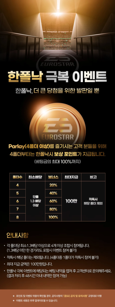 - 한폴낙 극복 이벤트에 해당되는 베팅 내역을 캡쳐 후 고객 센터로 문의해야 정상 참여 가능 (결과 처리후 48시간 이내 내역만 참여 가능)