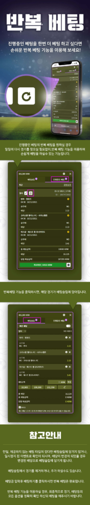 - 동일한 경기, 동일한 배당이 유지되지 않는 경우 일부 베팅 항목은 반복되지 않을 수 있습니다.