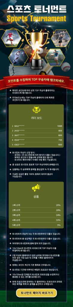 텐텐벳에서는 스포츠 베팅을 더욱 박진감 넘치게 즐길 수 있도록 ‘스포츠 토너먼트 이벤트’를 운영하고 있습니다. 본 이벤트는 단순한 베팅을 넘어 경쟁과 전략의 재미를 더한 방식으로, 일정 기간 동안 누적 포인트를 기준으로 우승자를 선정하고 상금을 배분하는 구조입니다. 이용자는 자신의 베팅 실력과 전략으로 리더보드 상위에 오를 수 있으며, 성과에 따라 실제 상금으로 보상을 받을 수 있습니다.