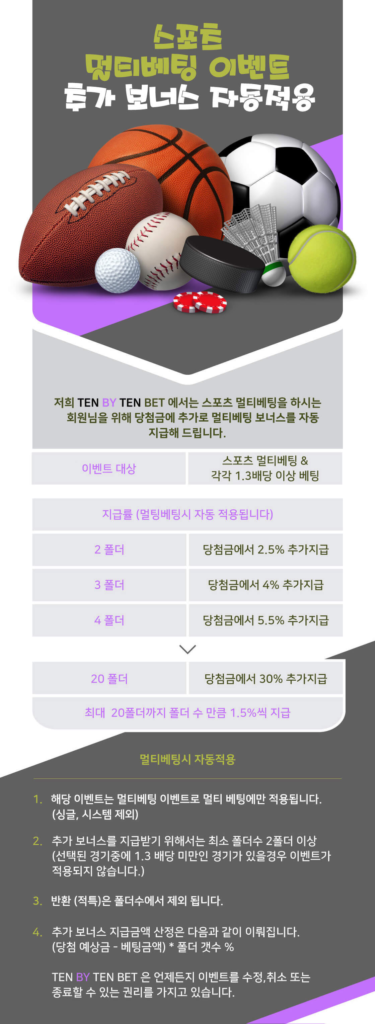 텐텐벳에서는 스포츠 멀티베팅을 즐기는 이용자들을 위해 추가 보너스 자동 지급 이벤트를 운영하고 있습니다. 동일한 경기 싱글 베팅이 아닌, 2폴더 이상 멀티 조합 베팅을 할 경우, 당첨금에 비례한 보너스가 자동으로 추가 지급됩니다.