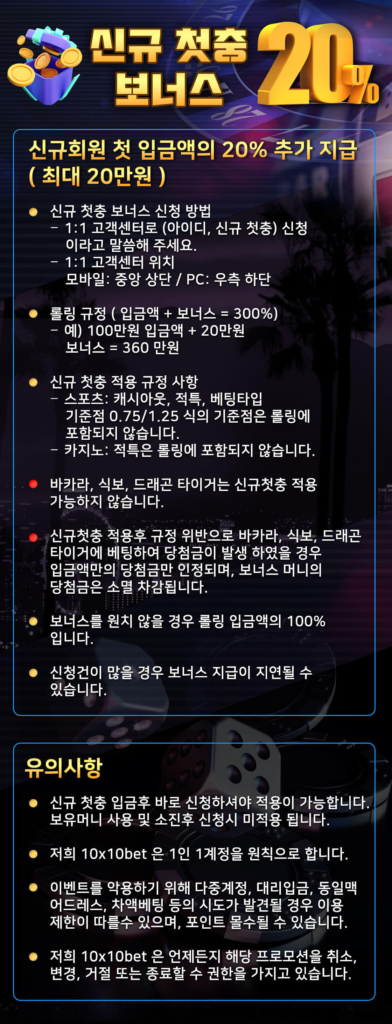 텐텐벳은 신규 가입 회원을 대상으로 첫 입금 시 특별한 보너스를 제공합니다. 첫 입금액의 20%를 추가 지급하며, 최대 20만 원까지 수령할 수 있는 이번 보너스는 신규 유저의 초기 베팅 자금을 더욱 탄탄하게 만들어주는 강력한 지원입니다.