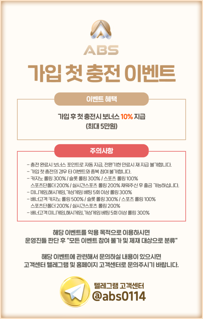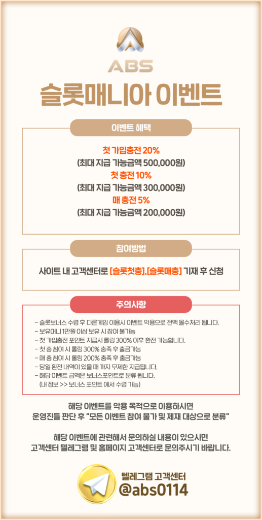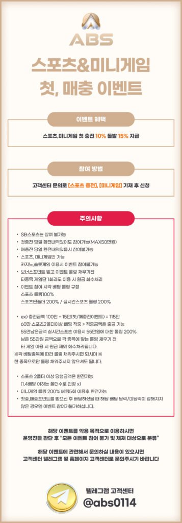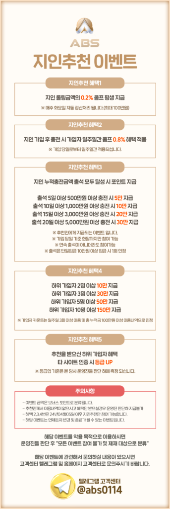 빠르고 안전한 온라인 베팅을 즐길 수 있는 ABS카지노의 또 다른 장점은 바로 신규 회원부터 기존의 회원까지 모두가 풍성한 혜택을 받을 수 있는 이벤트의 존재입니다. 특히 신규 회원으로 가입 시 받는 혜택을 시작으로 계속 게임을 즐기면 즐길수록 성장하는 레벨업 시스템을 통해서 더욱 풍성한 혜택을 받을 수 있게 짜인 이벤트 구성은 회원님들의 지갑을 더욱 두둑하게 해줄 것입니다. 다양한 혜택과 함께 안전한 베팅 생활을 누리고 싶은 분들에게 ABS카지노는 후회없는 선택이 될 것입니다.