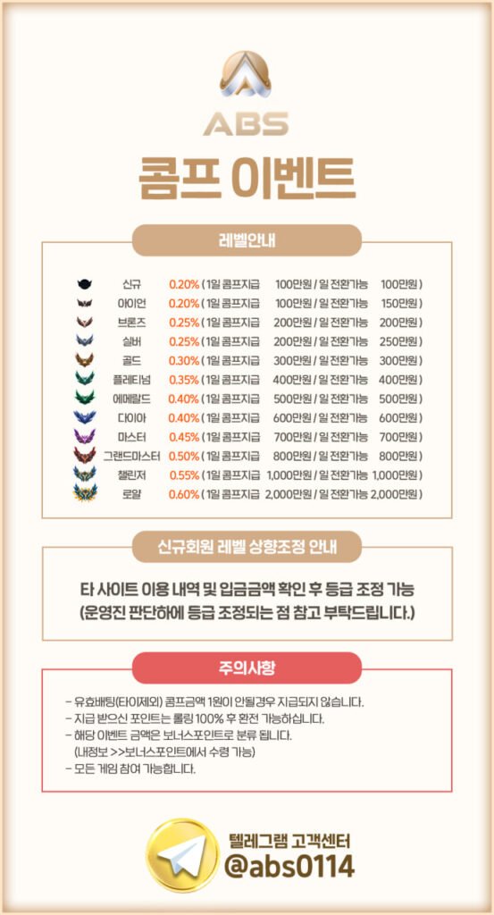 | 콤프 이벤트 | 등급에 따른 콤프 비율과 상한선 – 신규: 0.20% (일일 최대 100만원 / 일일 최대 전환 가능 100만원) – 아이언: 0.20% (일일 최대 100만원 / 일일 최대 전환 가능 150만원) – 브론즈: 0.25% (일일 최대 200만원 / 일일 최대 전환 가능 200만원) – 실버: 0.25% (일일 최대 200만원 / 일일 최대 전환 가능 250만원) – 골드: 0.30% (일일 최대 300만원 / 일일 최대 전환 가능 300만원) – 플레티넘: 0.35% (일일 최대 400만원 / 일일 최대 전환 가능 400만원) – 에메랄드: 0.40% (일일 최대 500만원 / 일일 최대 전환 가능 500만원) – 다이아: 0.40% (일일 최대 600만원 / 일일 최대 전환 가능 600만원) – 마스터: 0.45% (일일 최대 700만원 / 일일 최대 전환 가능 700만원) – 그랜드마스터: 0.50% (일일 최대 800만원 / 일일 최대 전환 가능 800만원) – 챌린저: 0.55% (일일 최대 1000만원 / 일일 최대 전환 가능 1000만원) – 로얄: 0.60% (일일 최대 2000만원 / 일일 최대 전환 가능 2000만원) 주의 사항 – 타 사이트 이용 내역 및 입금 금액을 확인 후 등급 조정 가능 – 유효 배팅 : 타이(무승부)를 제외한 유효 배팅에서 콤프 금액이 1원 미만일 경우, 콤프는 지급되지 않음 – 롤링 조건 : 지급받은 포인트는 롤링 100% 충족 후에 환전 가능 – 보너스 포인트: 해당 이벤트를 통해 지급된 금액은 보너스 포인트로 분류 – 모든 게임에 참여 가능 |