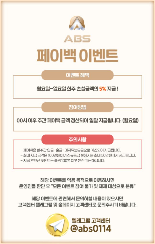 | 페이백 이벤트 | – 월요일부터 일요일까지의 한 주간 손실 금액의 5%를 페이백으로 지급 – 주간 페이백 금액은 월요일 00시 이후에 정산되어 일괄 지급 주의 사항 – 페이백 계산법 : 페이백은 한 주간의 입금액 – 출금액 – 마지막 보유금으로 계산되어 지급 – 최대 지급 금액 : 전체 회원은 최대 100만원, 신규 등급 회원은 최대 50만원까지 지급 – 롤링 조건 : 지급받은 포인트는 롤링 100% 충족 후에 환전 가능 |